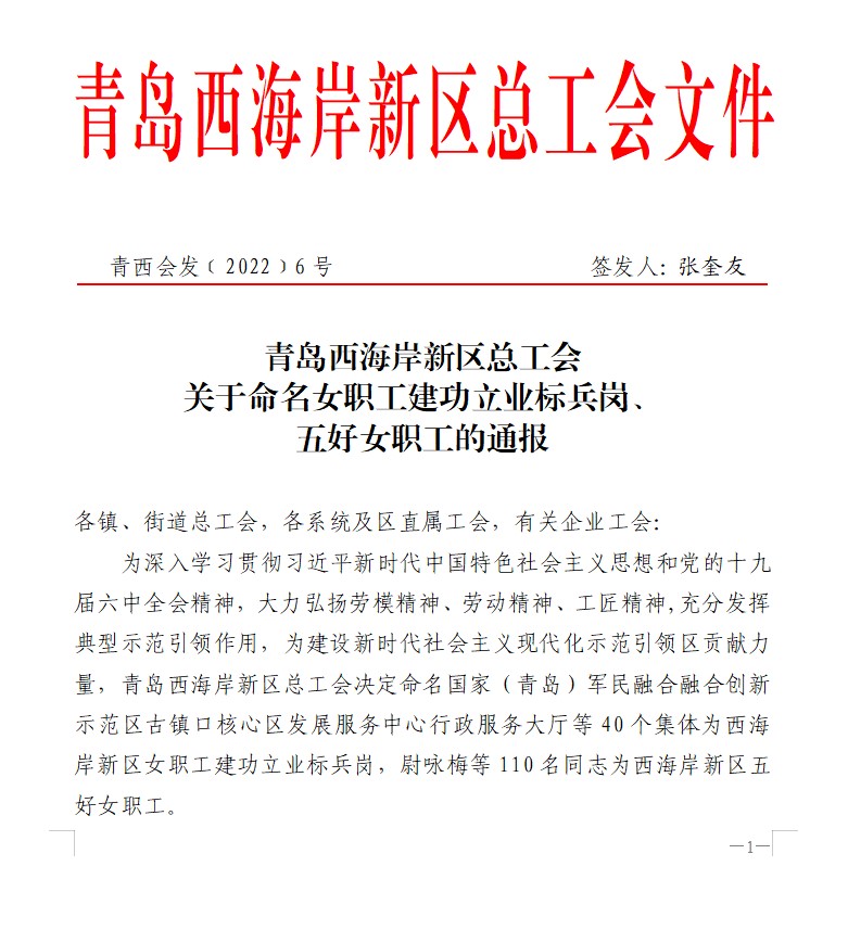 近日,青島西海岸新區(qū)女職工建功立業(yè)標兵崗名單出爐,包含40個集體,??丶瘓F法務和風控管理崗獲評該榮譽。